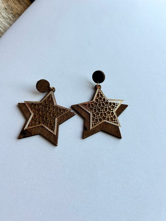 Wooden Gold Star Earrings