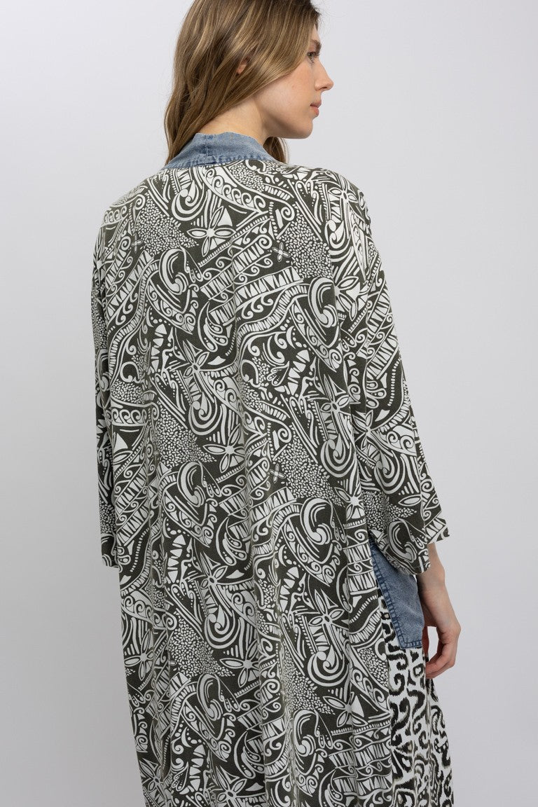 Open shawl with denim accents.