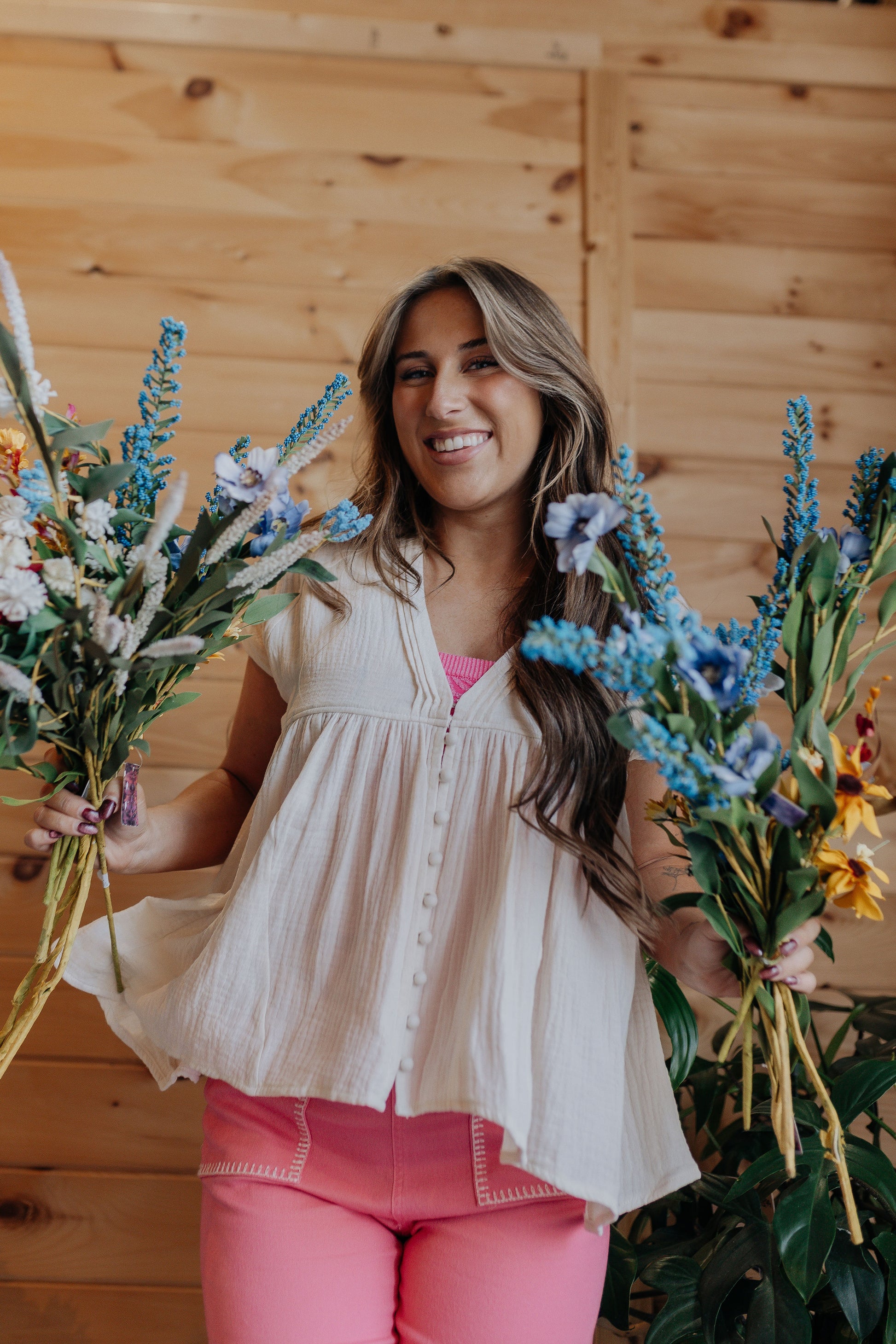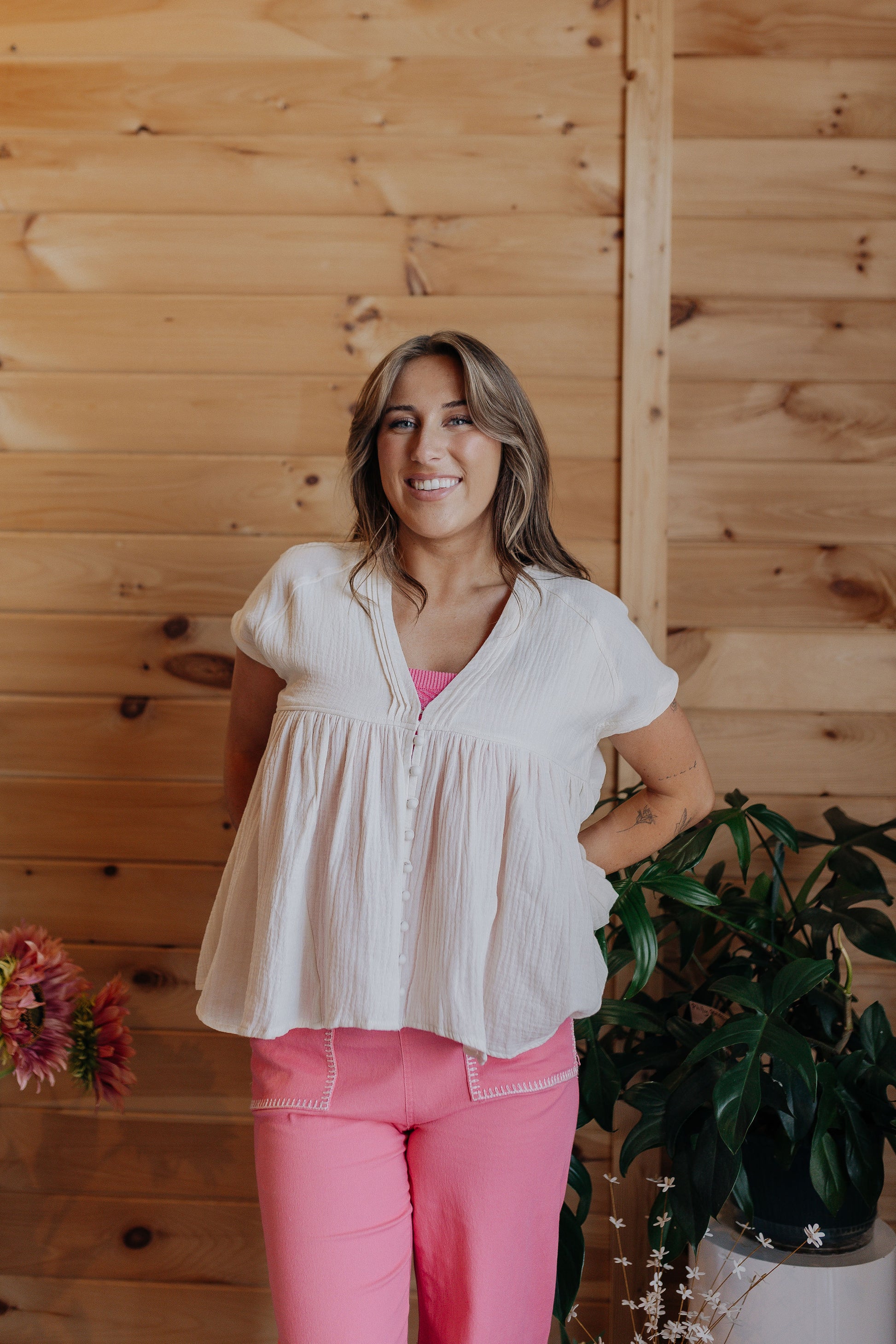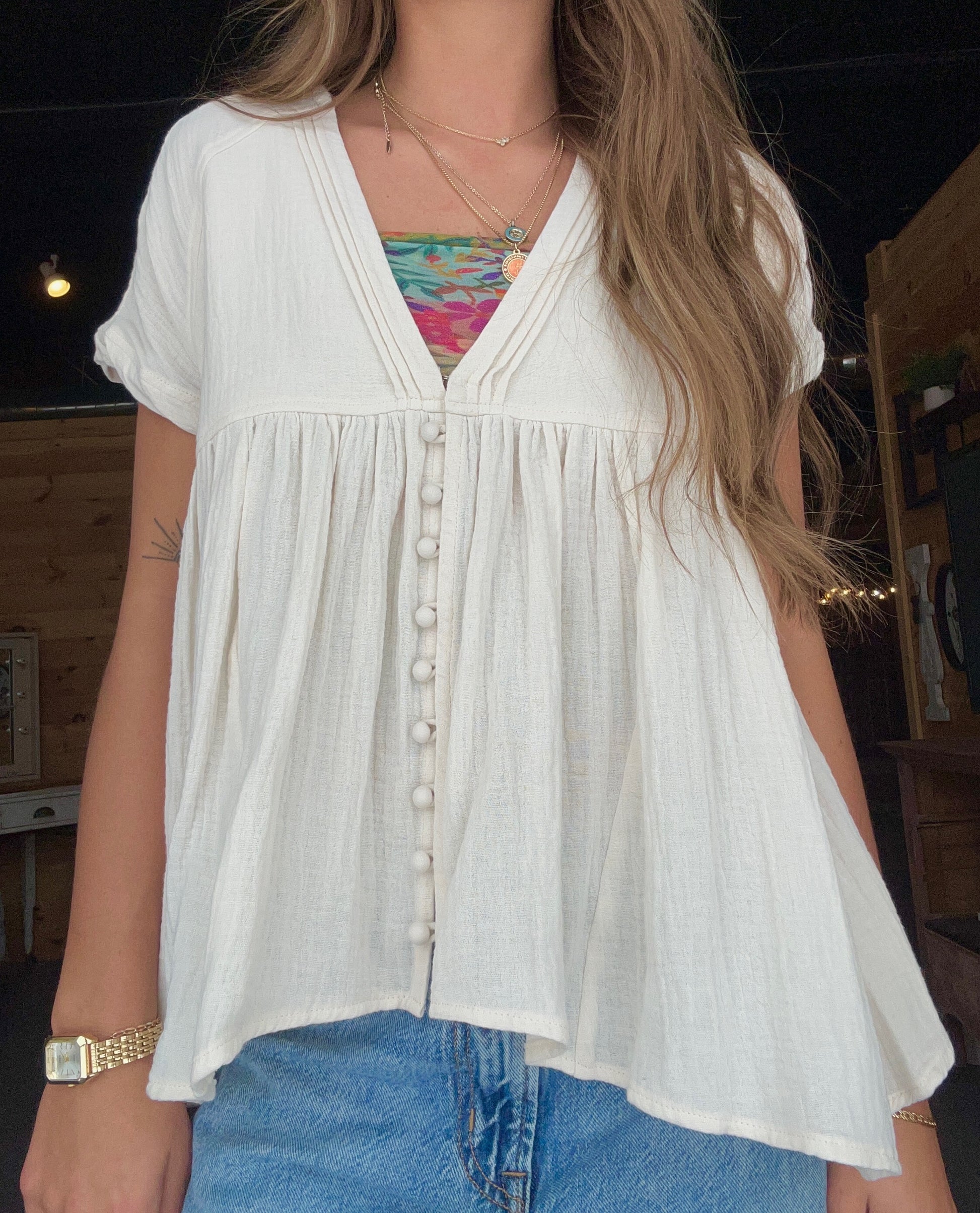 Woven cotton v-neck blouse with buttons down the front