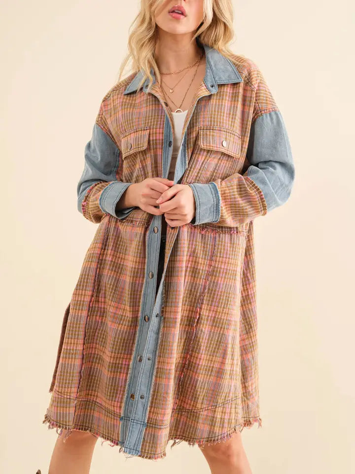 Plaid Garment Washed Denim Snap Up Oversized Long Shirt Jacket