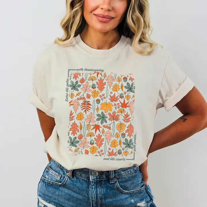 Celebrate the season of gratitude with this cozy and faith-filled fall tee. Featuring a beautiful array of autumn leaves in warm, earthy tones, this Comfort Colors shirt displays the verse: “Enter His gates with thanksgiving and His courts with praise” (Psalm 100:4). A perfect piece for Thanksgiving gatherings, fall festivals, or everyday wear to share your heart of thanks. Pressed in-house for top quality and softness you'll love all season long!