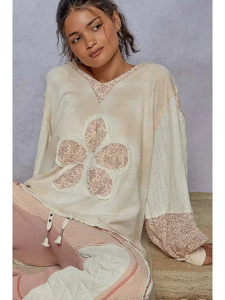 Designed in V-neck balloon sleeve relaxed fit hoodie top in thermal with cut and sew sweater knit patch, printed gauze flower patch, bottom opening panel point, raw edge, vintage washing, solid color.