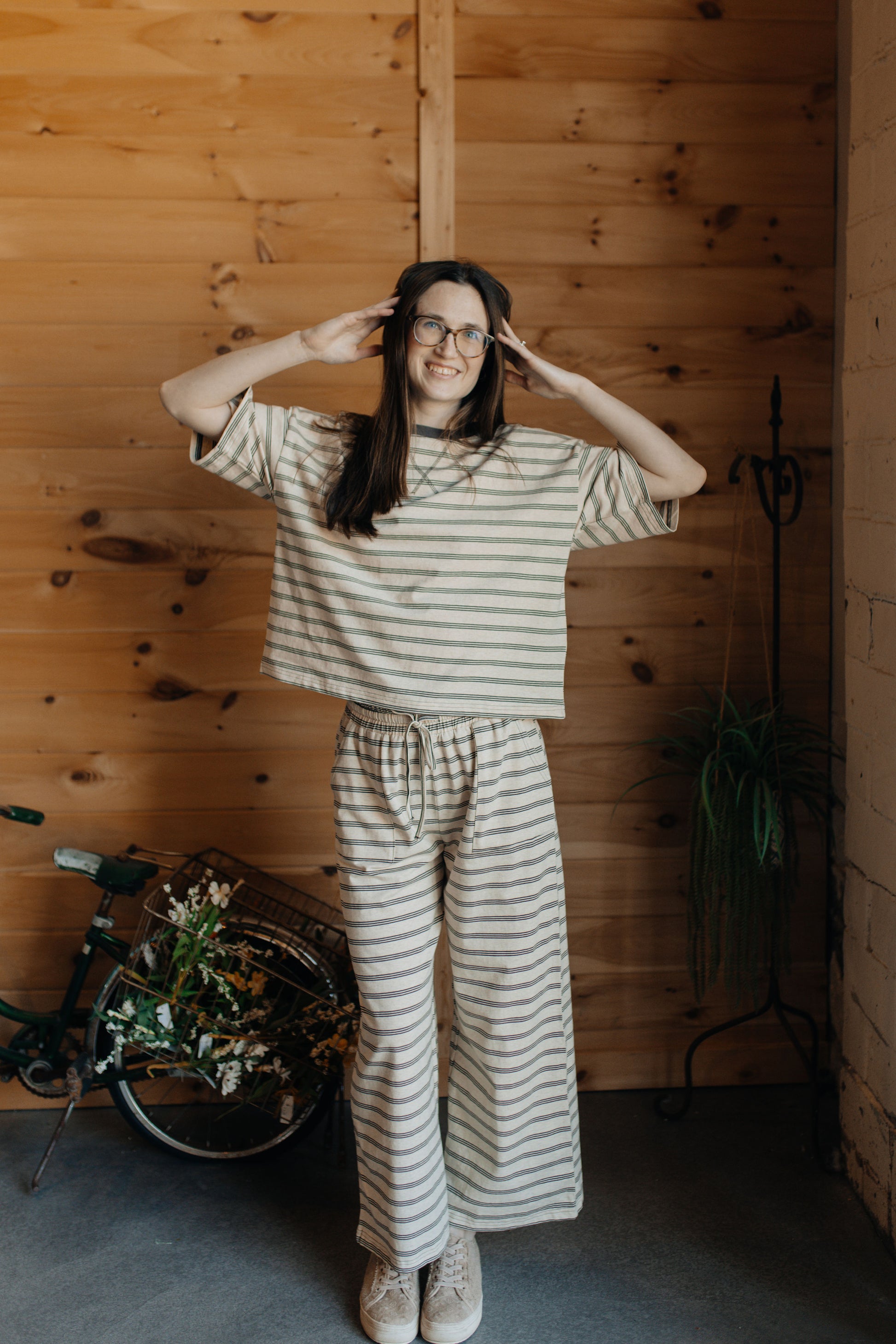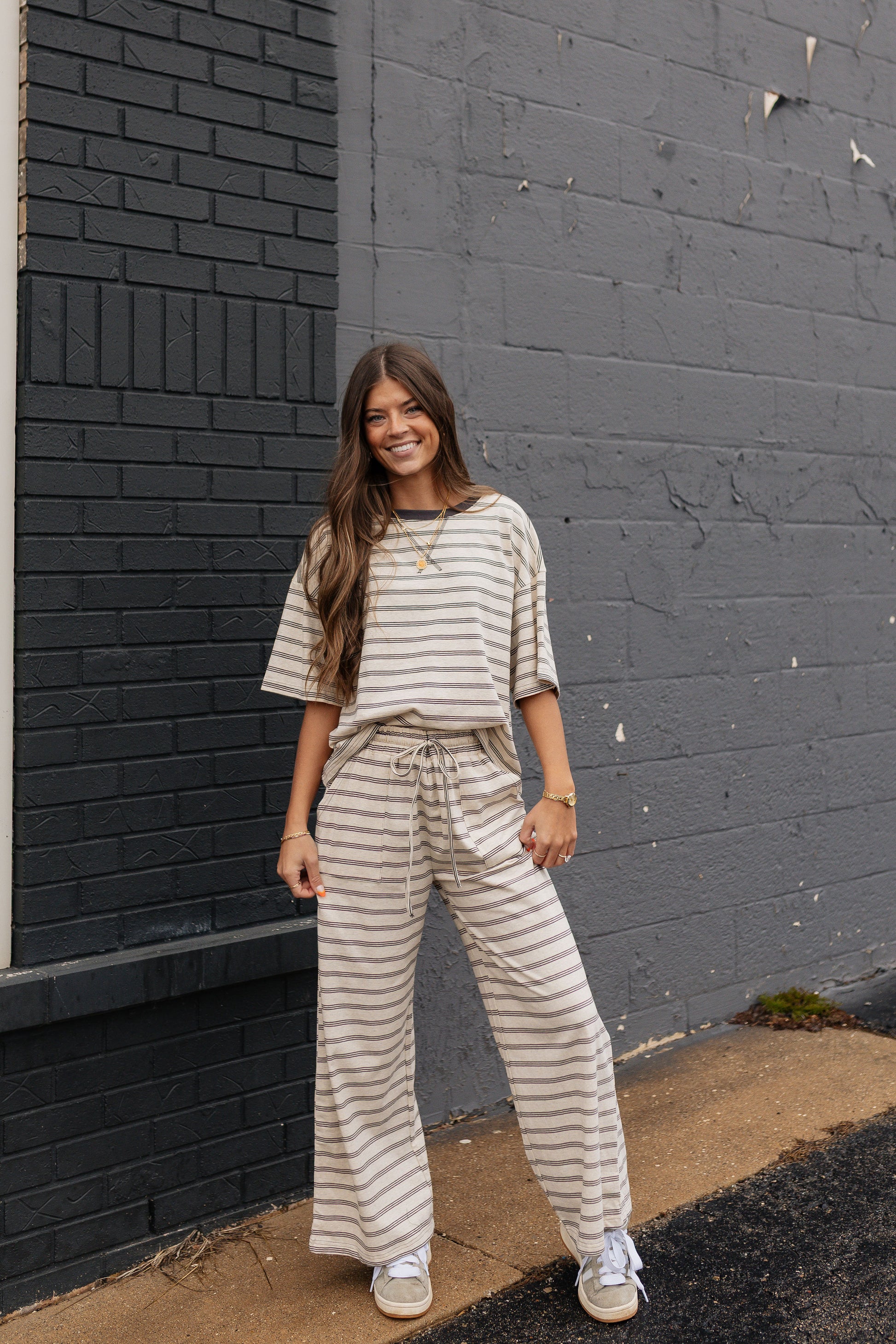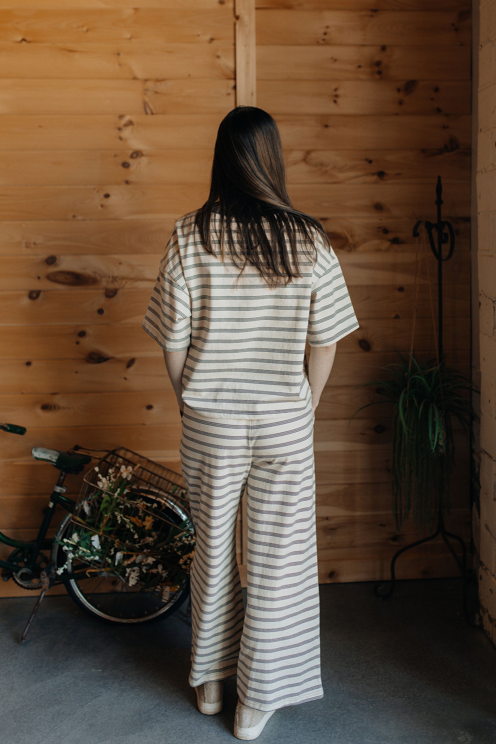 Striped knit lounge set with short sleeve top and matching wide leg pants